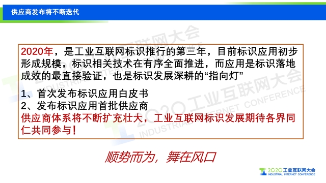 在2020工業互聯網大會“工業互聯網標識”主題論壇上,中國信息通信研究院工業互聯網和物聯網研究所副總工程師羅松分享了我國工業互聯網標識解析體系建設情況及中國信息通信研究院在建立標識應用供應商體系方面所做的工作,會上還發布了基于標識應用體系三大層級十個應用場景的首批工業互聯網標識應用供應商合作伙伴名單。