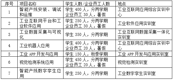 “工業(yè)互聯(lián)網(wǎng)產(chǎn)業(yè)聯(lián)盟 杭州科技職業(yè)技術學院工業(yè)互聯(lián)網(wǎng)應用實訓基地”建有:智能系統(tǒng)集成技術實訓中心、工業(yè)互聯(lián)網(wǎng)應用綜合實訓中心、工業(yè)控制系統(tǒng)實訓室、工業(yè)互聯(lián)網(wǎng)數(shù)據(jù)采集一體化實訓室、工業(yè)APP開發(fā)與應用實訓室、工業(yè)軟件應用實訓室、工業(yè)數(shù)字孿生實訓室、視覺檢測實訓室、工業(yè)機器人應用實訓室等專業(yè)實訓室,服務工業(yè)互聯(lián)網(wǎng)應用、電氣自動化技術、物聯(lián)網(wǎng)應用技術、人工智能技術應用、應用電子技術等專業(yè)的20余門課程。實訓基地開設的綜合實訓項目有:智能產(chǎn)線安裝、調(diào)試和運維、工業(yè)互聯(lián)網(wǎng)平臺和工業(yè)軟件應用、工業(yè)數(shù)據(jù)采集與可視化、工業(yè)機器人應用、工業(yè)APP開發(fā)與應用、視覺檢測系統(tǒng)應用、智能產(chǎn)線數(shù)字孿生應用等。具體開設計劃如表1所示:
