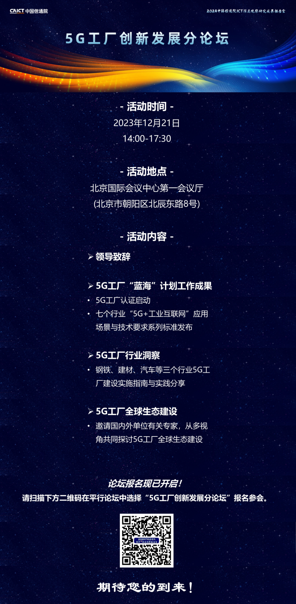 “2024中國信通院ICT深度觀察報告會”5G工廠創新發展分論壇將于2023年12月21日下午2點在北京國際會議中心第一會議廳開啟。論壇以“5G工廠 智造未來”為主題,全方面總結分享5G工廠創新發展的重要意義和未來趨勢,打造5G工廠中國品牌,推進“5G+工業互聯網”創新發展,探索利用創新技術促進企業數字化轉型,為推進新型工業化提供有力支撐。