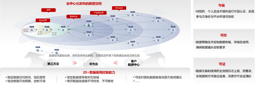 數據空間作為目前為止解決數據可信流通最合適的解決方案之一,結合華為實踐,可以將其理解為實現數據跨主體,跨邊界流通的“可信、可控、可證”的解決方案:
