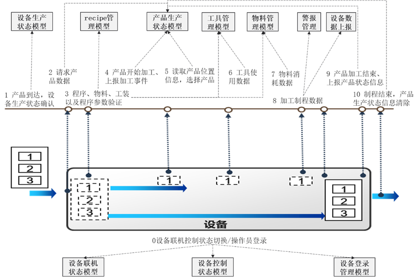 生產設備信息交互模型是以設備為中心,從數字化應用角度來看加工產品的生命周期,回答設備是否可用(比如聯機狀態、控制狀態、運行狀態模型等),設備哪些能用(recipe模型、物料模型、工具模型等)、設備如何好用(設備數據上報模型、警報管理模型等)這三個核心問題。