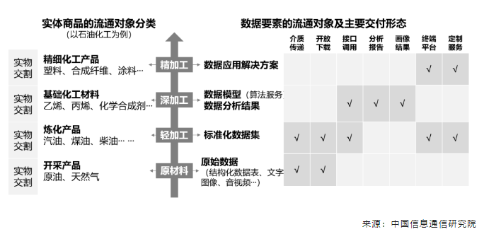 答:從流通對(duì)象來看,流通中的數(shù)據(jù)包括從原料到衍生服務(wù)的多種形態(tài)(如圖1)。就產(chǎn)品形態(tài)而言,流通中的數(shù)據(jù)產(chǎn)品可以參照實(shí)體商品的加工程度來進(jìn)行區(qū)分。類比石油化工領(lǐng)域,原油、天然氣等是一經(jīng)開采即可得到的原材料,在此基礎(chǔ)上進(jìn)行不同程度的煉化和加工得到不同類型的下游消費(fèi)產(chǎn)品,一類如汽油、煤油等成品油,是對(duì)原材料進(jìn)行煉化得到的輕加工產(chǎn)品;一類如乙烯、丙烯等基礎(chǔ)化工材料是煉化后經(jīng)裂解得到的深加工產(chǎn)品;一類如塑料、合成纖維等精細(xì)化工材料是對(duì)基礎(chǔ)化工材料進(jìn)一步加工合成得到的精加工產(chǎn)品。相應(yīng)地,在數(shù)據(jù)流通領(lǐng)域,原始數(shù)據(jù)、標(biāo)準(zhǔn)化數(shù)據(jù)集、數(shù)據(jù)模型或分析結(jié)果、數(shù)據(jù)應(yīng)用解決方案可大致對(duì)應(yīng)不同加工程度得到的數(shù)據(jù)產(chǎn)品和服務(wù)。