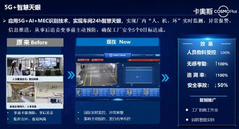 智慧天眼:以5G+AI深度學(xué)習(xí)、MEC邊緣云計算技術(shù)為依托,基于現(xiàn)有視頻流,實現(xiàn)廠內(nèi)“人、機、環(huán)”實時監(jiān)測、異常報警、信息推送,從事后追責變事前主動預(yù)防,確保工廠安全5個0目標達成。