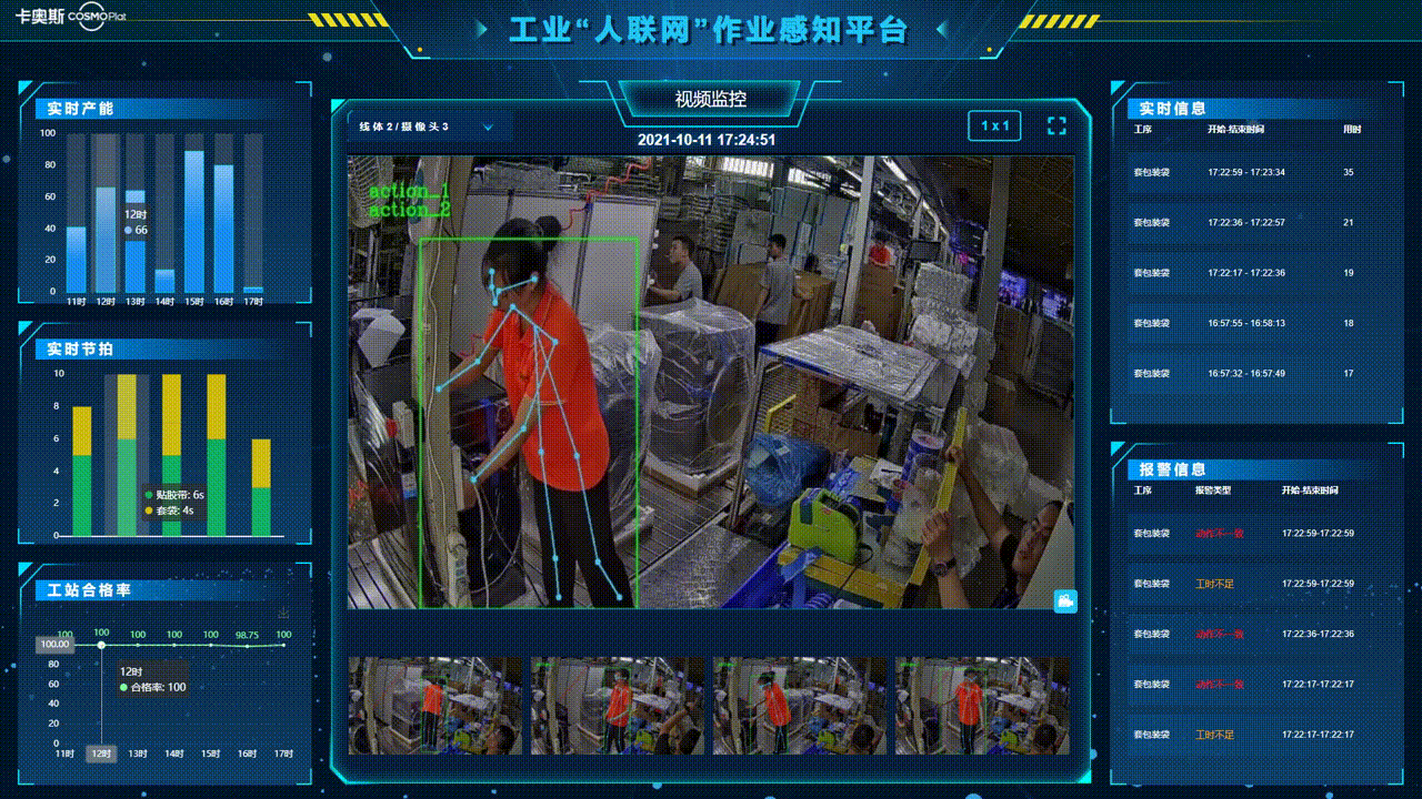 作業(yè)感知:以生產(chǎn)崗位人員的操作動作切入,解決因操作動作出現(xiàn)問題導(dǎo)致的質(zhì)量事故,同時對節(jié)拍、工步、軌跡有分析能力,對工人工作流程步驟進行解析,分析無效動作及有效動作,不斷優(yōu)化生產(chǎn)步驟,優(yōu)化改良生產(chǎn)作業(yè)規(guī)范過程,有效提升了工人工作效率的同時降低了工人的工作量。