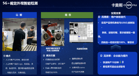 機器視覺:5G+機器視覺應(yīng)用后,網(wǎng)線辮子沒了,工控機取消,工業(yè)現(xiàn)場實現(xiàn)輕量化部署,部署周期由原來的1個月縮短到1周;算法上移到MEC可以根據(jù)各場景實際處理情況統(tǒng)一配置計算能力,實現(xiàn)數(shù)據(jù)、算法的多工位共享,整體投資降低約40%,同時輸入樣本量大,也保證了檢測算法的不斷優(yōu)化,質(zhì)量檢測準確率也大大提升。