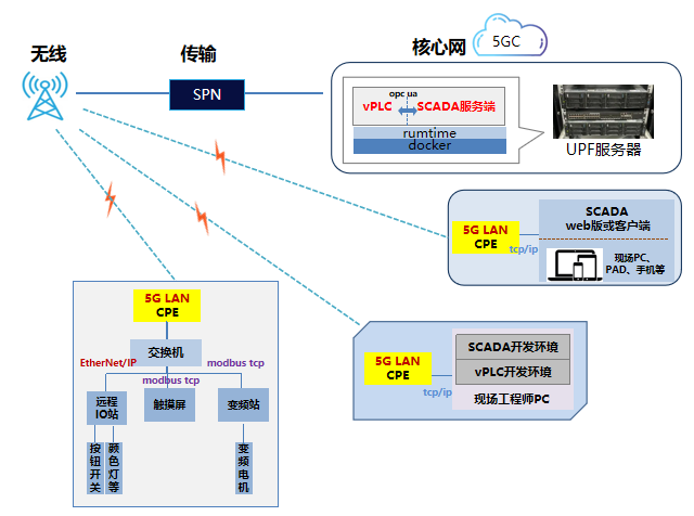 虛擬化PLC是將傳統(tǒng)的硬件PLC以軟件化的方式部署在5G邊緣算力平臺上,進一步降低PLC南向5G控制的時延。需驗證基于5G UPF基座的虛擬化PLC滿足通過5G進行實時IO控制、變頻運動控制、伺服運動控制、觸摸屏交互、調(diào)試站交互等工業(yè)場景。