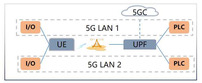 通過5G LAN組網(wǎng),5G LAN內(nèi)部的組播通信,實現(xiàn)主備PLC的冗余部署。