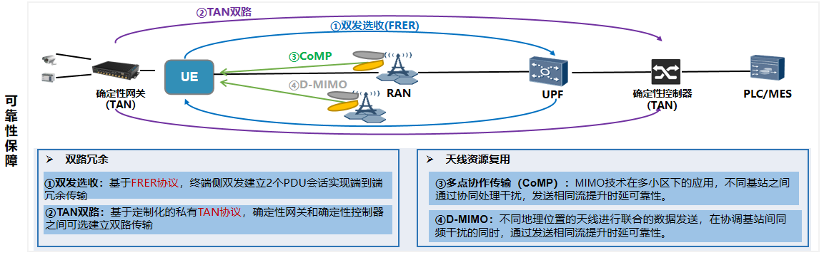 5G網(wǎng)絡的可靠性保障,主要通過冗余傳輸來實現(xiàn),包括無線空口的冗余傳輸、5G內(nèi)部的冗余傳輸(TSN 802.1CB)、業(yè)務級的冗余傳輸(比如基于TAN協(xié)議)等。