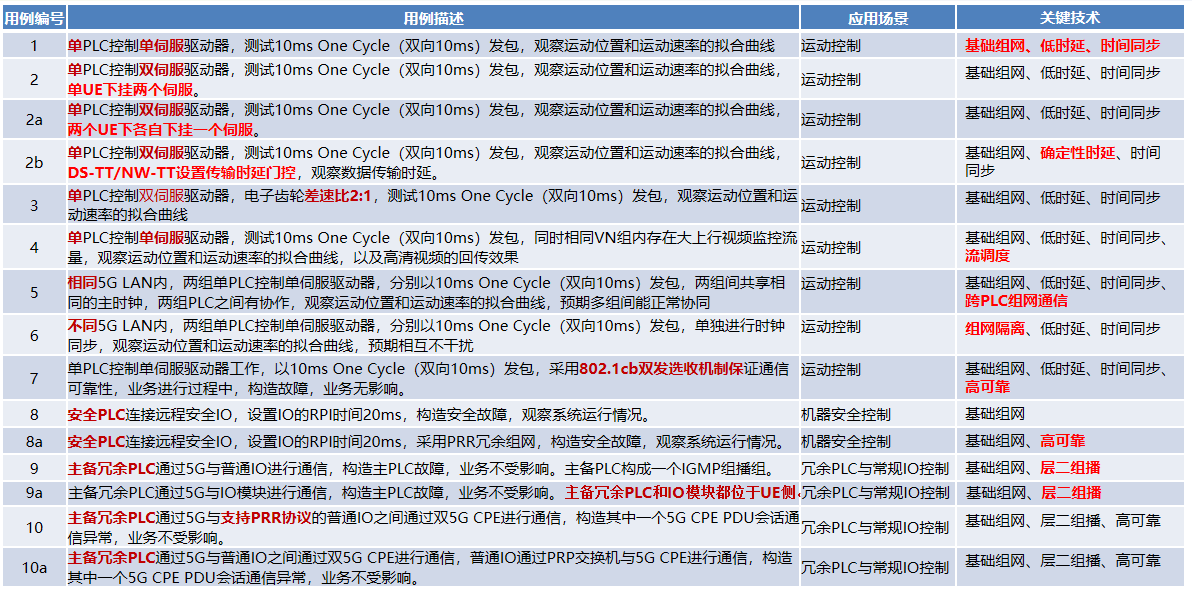 驗證5G確定性技術(shù)的能力,驗證產(chǎn)業(yè)的支持度,驗證5G與工業(yè)協(xié)議的融合度,驗證5G通信能力對工業(yè)自動化應用場景(數(shù)據(jù)采集、普通IO、機器安全控制、運動控制)的覆蓋能力,發(fā)現(xiàn)并解決存在的問題。