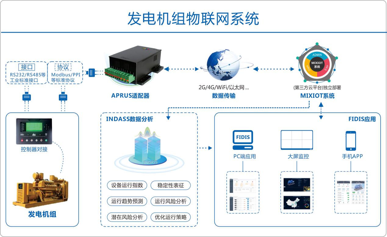 本方案通過適配器實(shí)現(xiàn)多源異構(gòu)數(shù)據(jù)采集、遠(yuǎn)程控制執(zhí)行、集中智能控制、以及邊緣計(jì)算服務(wù)。針對(duì)發(fā)電機(jī)(組)設(shè)備使用場(chǎng)景及地域,本項(xiàng)目提供不同版本的適配器,包括APRUS II 和 APRUS III(第二代、第三代可編程工業(yè)互聯(lián)網(wǎng)適配器)、APIECO(可編程工業(yè)互聯(lián)網(wǎng)邊緣計(jì)算控制器)。APRUS II 和 APRUS III 適用于大多數(shù)工業(yè)設(shè)備,通過可編程方法,決定使用不同物理接口、使用不同數(shù)據(jù)交互協(xié)議、與不同平臺(tái)交互,可廣泛適配各自不同工業(yè)設(shè)備。APIECO 除了兼有 APRUS 系列的數(shù)據(jù)采集功能外,還可以實(shí)現(xiàn)邊緣計(jì)算,以及復(fù)雜裝置的聯(lián)動(dòng)智能控制。數(shù)據(jù)傳輸支持2G、4G及wifi傳輸,保障客戶數(shù)據(jù)的實(shí)時(shí)獲取。