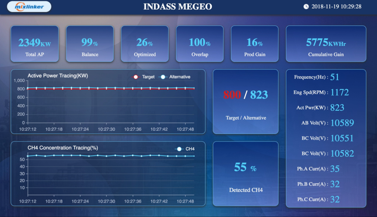 在成功采集濟(jì)柴沼氣發(fā)電機(jī)組設(shè)備運(yùn)行數(shù)據(jù)后,智物聯(lián)MixIOT收集大量數(shù)據(jù)樣本,對(duì)此類數(shù)據(jù)樣本進(jìn)行分析、處理、計(jì)算,同時(shí)與濟(jì)柴進(jìn)行合作,建立符合實(shí)際生產(chǎn)場(chǎng)景的數(shù)學(xué)模型,并應(yīng)用于中油濟(jì)柴的客戶膠州百川電廠的沼氣發(fā)電機(jī)組,在實(shí)際生產(chǎn)場(chǎng)景中,系統(tǒng)可以根據(jù)沼氣(甲烷)濃度來實(shí)時(shí)計(jì)算出發(fā)電機(jī)組有功功率最優(yōu)值,幫助客戶提升發(fā)電能效,提高發(fā)電收益。