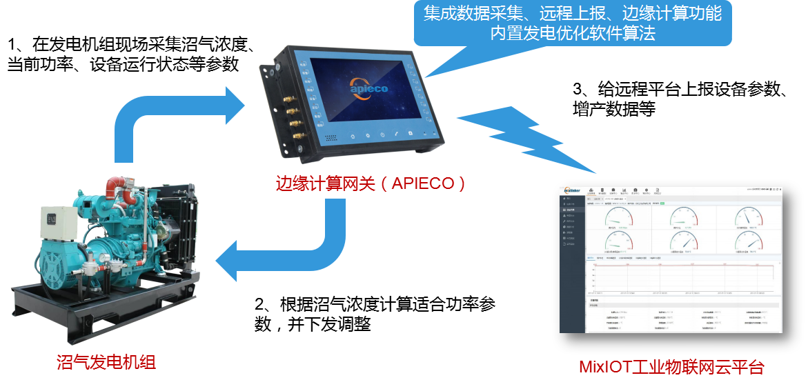 本方案沼氣發(fā)電效率優(yōu)化Megeo((Methane Generator Edge Optimizer))主要由智物聯(lián)的邊緣計(jì)算控制器(APIECO)和工業(yè)互聯(lián)網(wǎng)平臺(tái)(MixIOT)組成,邊緣計(jì)算控制器工作在設(shè)備端,一方面采集設(shè)備運(yùn)行相關(guān)參數(shù),一方面用內(nèi)部算法模型自動(dòng)匹配不同的甲烷濃度對(duì)應(yīng)的最佳功率值,并自動(dòng)調(diào)節(jié)功率,讓機(jī)組發(fā)電效率達(dá)到最優(yōu)。這些設(shè)備運(yùn)行參數(shù),以及通過優(yōu)化后機(jī)組發(fā)電量的增量,邊緣計(jì)算控制器除了在界面進(jìn)行展示之外,還將這些數(shù)據(jù)上報(bào)到MixIOT平臺(tái)。MixIOT一方面展示設(shè)備運(yùn)行參數(shù)以及設(shè)備功率優(yōu)化效果,另一方面對(duì)所有設(shè)備進(jìn)行集中管理以及策略優(yōu)化。