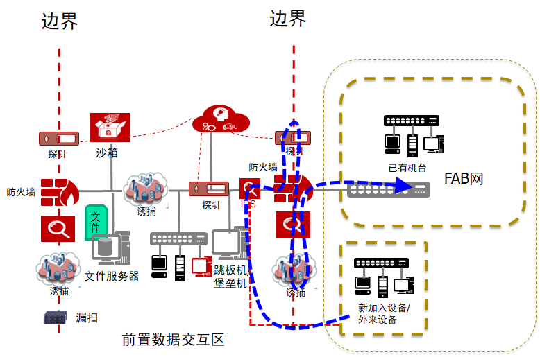 2、所有子網的邊界處部署流量探針,防火墻、IPS、路由器和交換機部署日志探針。