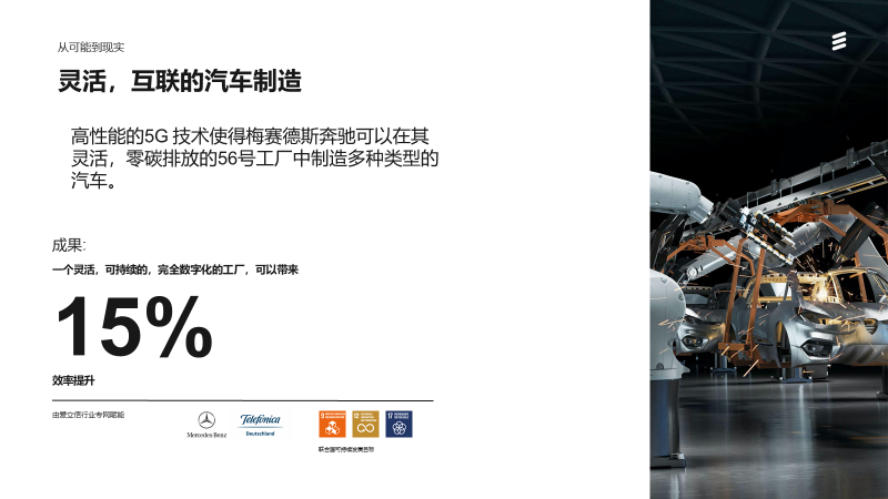 愛立信攜手西班牙電信(Telefonica)為德國梅賽德斯-奔馳 56號工廠全部220,000平方米廠房提供5G企業(yè)專網(wǎng)信號覆蓋,使用這一靈活的、高性能的網(wǎng)絡基礎(chǔ)設(shè)施滿足新一代產(chǎn)線設(shè)備的高效、柔性化、高容量連接需求,以期實現(xiàn):