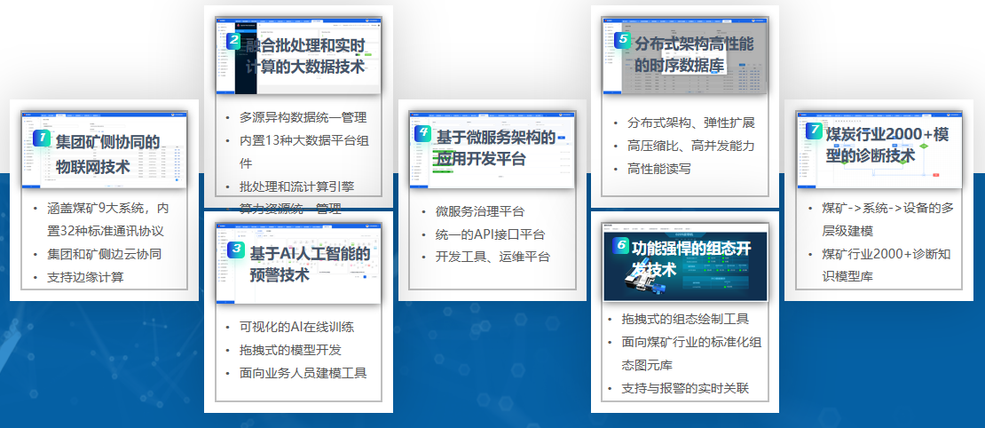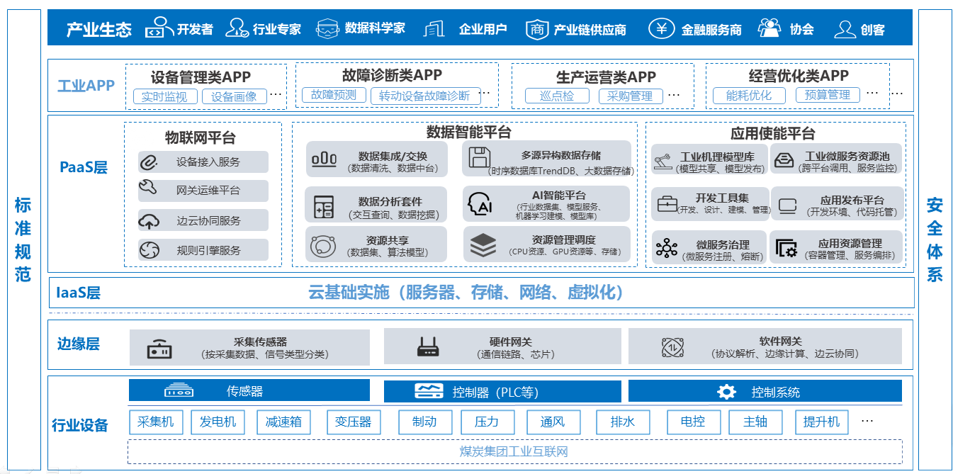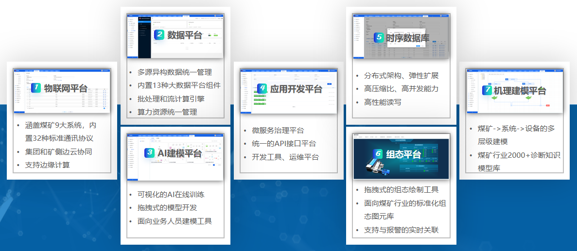 (1)構(gòu)建一個(gè)集團(tuán)統(tǒng)一的煤炭行業(yè)工業(yè)互聯(lián)網(wǎng)基礎(chǔ)平臺(tái),平臺(tái)至少包含物聯(lián)網(wǎng)平臺(tái)、數(shù)據(jù)平臺(tái)、AI建模平臺(tái)、機(jī)理建模平臺(tái)、應(yīng)用開(kāi)發(fā)與管理平臺(tái)、組態(tài)平臺(tái)、時(shí)序數(shù)據(jù)庫(kù),為企業(yè)智能化應(yīng)用建設(shè)提供基礎(chǔ)平臺(tái)支持;