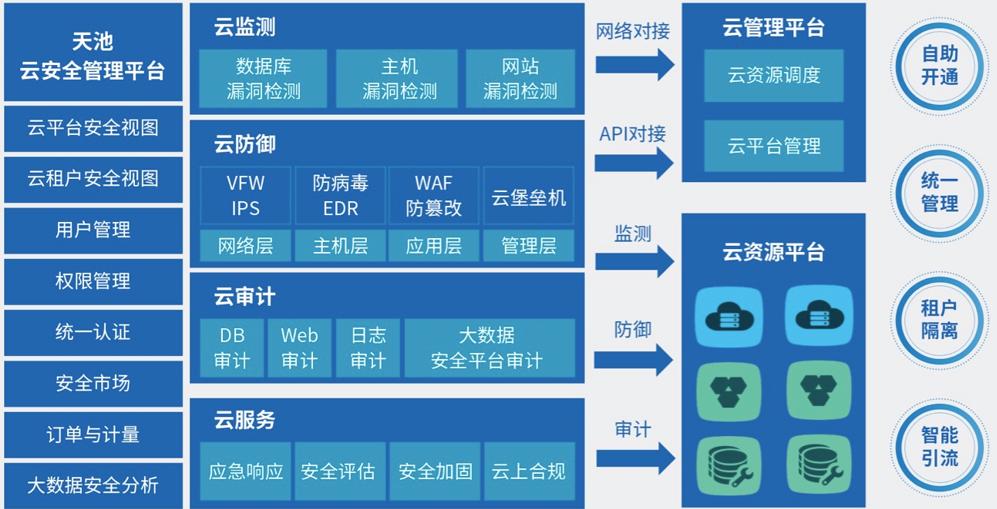 對各種安全能力集中管理調度,結合大數據分析,為云租戶提供安全視圖,對云資源實現整體安全感知