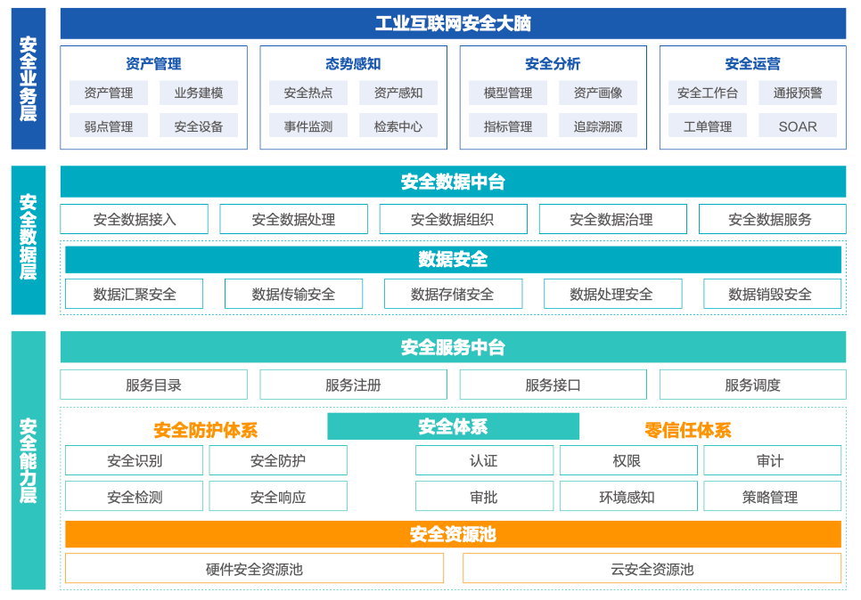 針對上述平臺架構,安恒信息整體采用SaaS化服務的設計思路,平臺建設安全能力,圍繞一中心、兩體系、統一資源池建設,滿足工業企業安全數據匯聚、多云異構兼容、服務分層解耦、新老應用并存等復雜安全需求,實現對云平臺、大數據、應用、網絡、邊界、終端的全面安全賦能通過一個運營平臺實現整體安全運營,減輕運維工作量。