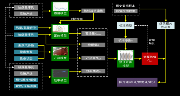 燃煤作為熱電廠最主要的原料,是影響熱電廠控制的關鍵。燃煤作為天然礦物其成份是不均勻的,而且大多數熱電廠都需要將多種來源的燃煤進行摻配使用,所以實時入爐的燃煤品質是波動的。目前還沒有有效的技術對燃煤成份進行在線實時檢測,所以燃煤成份都是通過抽樣離線化驗獲得的。當煤質發生較大變化時,缺乏煤質的及時感知會導致控制不穩定的問題。如下是一套煤質軟測量的原理圖: