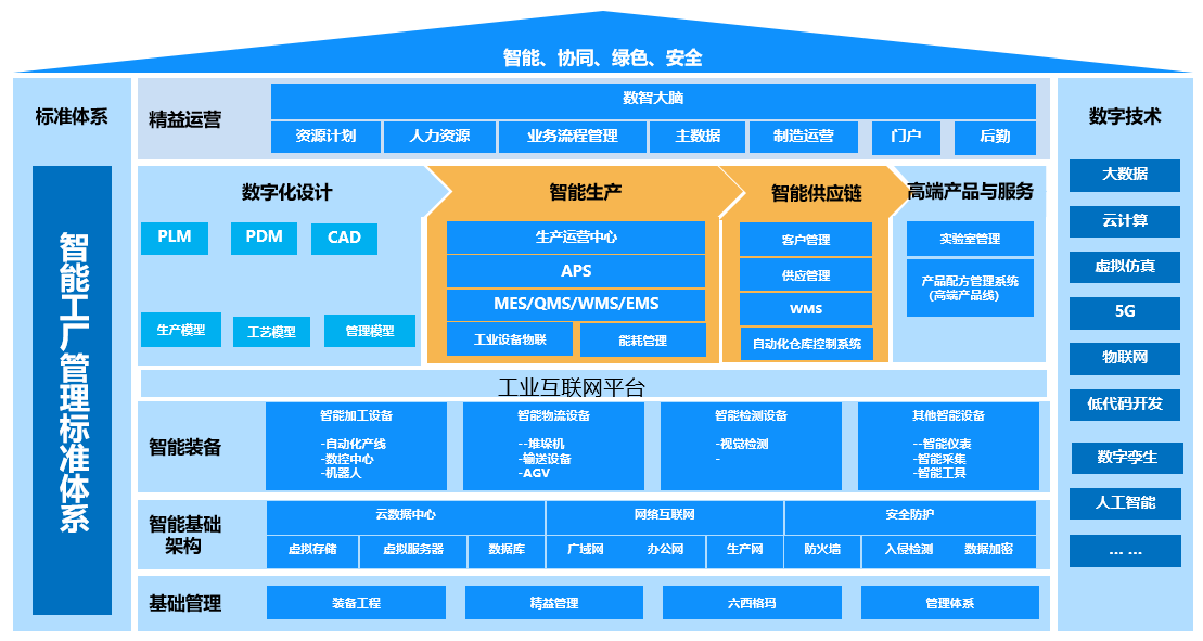 以智能、協(xié)同、綠色、安全的建設目標為出發(fā)點,本項目重點實現(xiàn)生產(chǎn)制造過程的智能化,智造全流程全要素數(shù)字化,總部與基地協(xié)同制造,安全及綠色用能管理,打造全連接智能工廠,未來綜合研發(fā)能力、工程能力、營銷能力、供應鏈能力提升,實現(xiàn)智能工廠戰(zhàn)略目標。