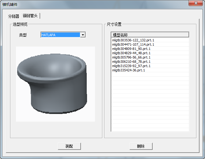 可選擇需要的錨鏈輪種類,錨鏈輪均為族表樣式,可進行新建裝配,替換選型以及刪除動作;可及時看到當前設計要求選用的錨鏈直徑是多少,可根據此數值作為選型參考;在此功能區,可自定義截圖作為選型參考。