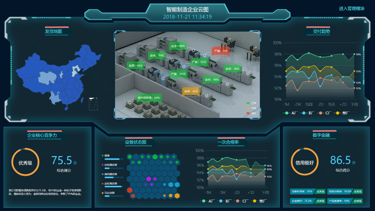 建立智能制造企業云圖,與現有業務系統集成,作為信息化,智能化的一個重要組成部分,負責公司各系統關鍵數據采集、匯總、分析處理,并以圖形化,虛擬加實景形態展現,以達到透明化管理、調度、控制、優化的目的。將有利于公司全價值鏈信息暢通,提高設備利用率和生產力,降低能耗,提升綜合競爭力。