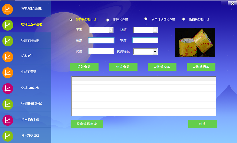 第二步:APP根據(jù)產(chǎn)品包裝方案自動(dòng)進(jìn)行詳細(xì)物料設(shè)計(jì),工程師可以對(duì)物料尺寸進(jìn)行修改,通過相似性識(shí)別技術(shù),對(duì)物料中能夠借用已有物料的自動(dòng)進(jìn)行替換,無法借用的,工程師通過APP進(jìn)行編碼申請(qǐng),自動(dòng)創(chuàng)建新的物料進(jìn)行使用。