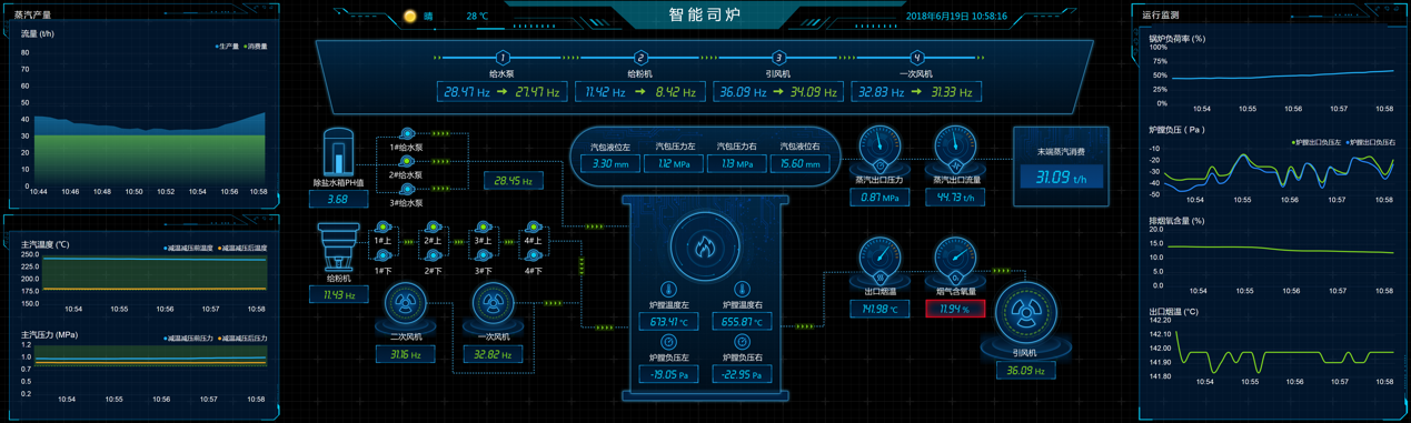 該APP基于熱能生產(chǎn)過(guò)程的全工藝過(guò)程數(shù)據(jù)建立熱能生產(chǎn)的數(shù)字孿生和數(shù)據(jù)模型,并基于模型實(shí)現(xiàn):智能司爐、生產(chǎn)監(jiān)控、管網(wǎng)平衡、設(shè)備管理、經(jīng)營(yíng)分析。輔助司爐工、設(shè)備管理者、生產(chǎn)管理者等角色實(shí)現(xiàn)基于數(shù)據(jù)的個(gè)性化、最優(yōu)化司爐操作、設(shè)備維保和生產(chǎn)管理,實(shí)現(xiàn)安全事故降低80%、熱能生產(chǎn)效率提升30%、生產(chǎn)成本降低10%,輔助熱能生產(chǎn)進(jìn)入智能化時(shí)代。如下圖是一個(gè)智能司爐界面,基于數(shù)據(jù)模型為一線司爐人員提供最優(yōu)化的鍋爐控制操作。