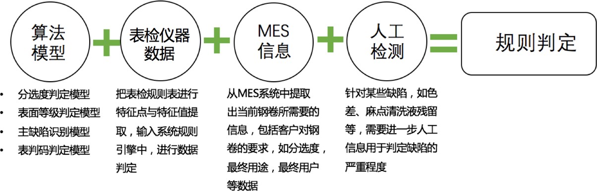 首先,表檢儀將非結構化數據(圖片信息)結構化,將幾千種產品外觀缺陷歸納為 60-70 大類,例如:平整斑、翹皮、擦傷、壓印、麻點、氣泡等。 其次,表檢數據結合 MES 數據輸入到模型中進行訓練,通過聚類算法、規則引擎(含用戶需求識別的自學習重構功能)、缺陷嚴重程度量化模型等深度學習技術,對軋鋼分級最初步判定。最后,再結合人工的進一步確認得出最終判定結果。