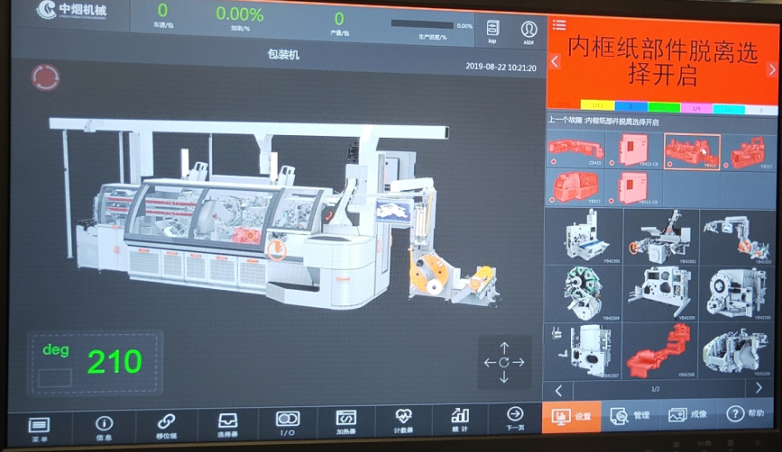 ZB415煙機(jī)產(chǎn)線由主機(jī)加輔機(jī)組成,體積龐大。該智能機(jī)組內(nèi)置超過(guò)400個(gè)采集點(diǎn)位,每個(gè)點(diǎn)位的數(shù)據(jù)采集頻率均為毫秒級(jí)。因此系統(tǒng)每秒會(huì)產(chǎn)生海量的數(shù)據(jù),要將這些數(shù)據(jù)實(shí)時(shí)的傳輸?shù)綌?shù)字孿生系統(tǒng)中就需要5G網(wǎng)絡(luò)大帶寬的加持,通過(guò)數(shù)字孿生系統(tǒng)對(duì)機(jī)組的運(yùn)行狀態(tài)進(jìn)行遠(yuǎn)程的控制,如開機(jī)、停機(jī)、復(fù)位、包裝速度調(diào)整等。5G網(wǎng)絡(luò)的低時(shí)延、高可靠性確保了這些控制指令下發(fā)的實(shí)時(shí)性和可靠性。當(dāng)機(jī)組某一個(gè)零部件出現(xiàn)故障時(shí),數(shù)字孿生系統(tǒng)會(huì)通過(guò)布置在機(jī)組內(nèi)部的傳感器檢測(cè)到該零件,并立即在系統(tǒng)內(nèi)進(jìn)行報(bào)警;同時(shí)會(huì)聯(lián)動(dòng)監(jiān)控?cái)z像頭定位到出現(xiàn)故障的零部件的位置,并放大監(jiān)控畫面以便于控制中心的專家進(jìn)行進(jìn)一步的故障診斷和確認(rèn)。