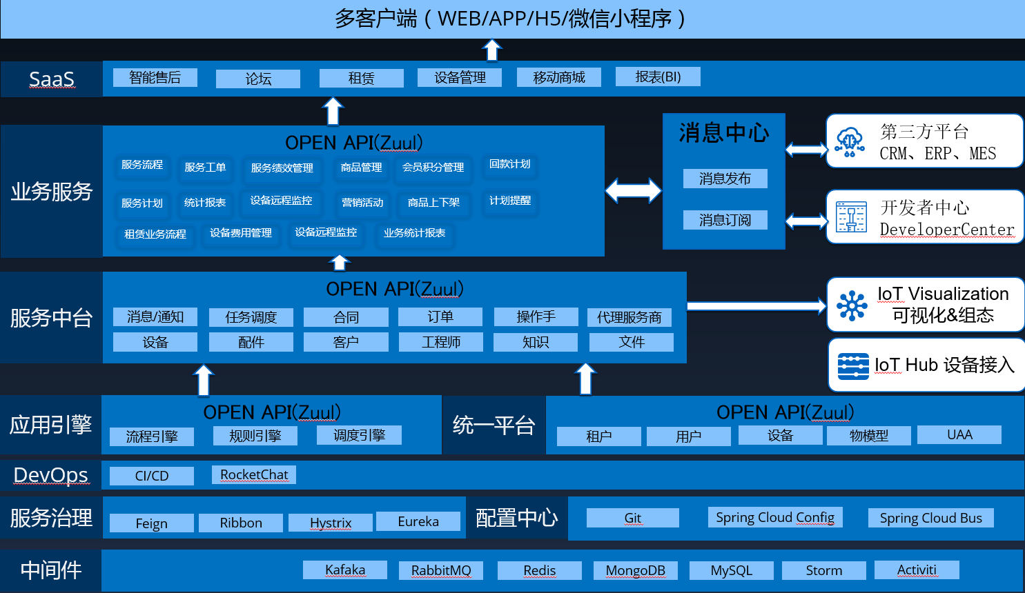 在平臺(tái)層:設(shè)備的數(shù)據(jù)傳送到平臺(tái)之后,對(duì)數(shù)據(jù)進(jìn)行整理,提取有用的信息,并將相關(guān)的數(shù)據(jù)規(guī)整到服務(wù)中臺(tái)上面,通過(guò)不同模塊的功能提供給應(yīng)用層來(lái)進(jìn)行調(diào)用,提高功能模塊的復(fù)用性。