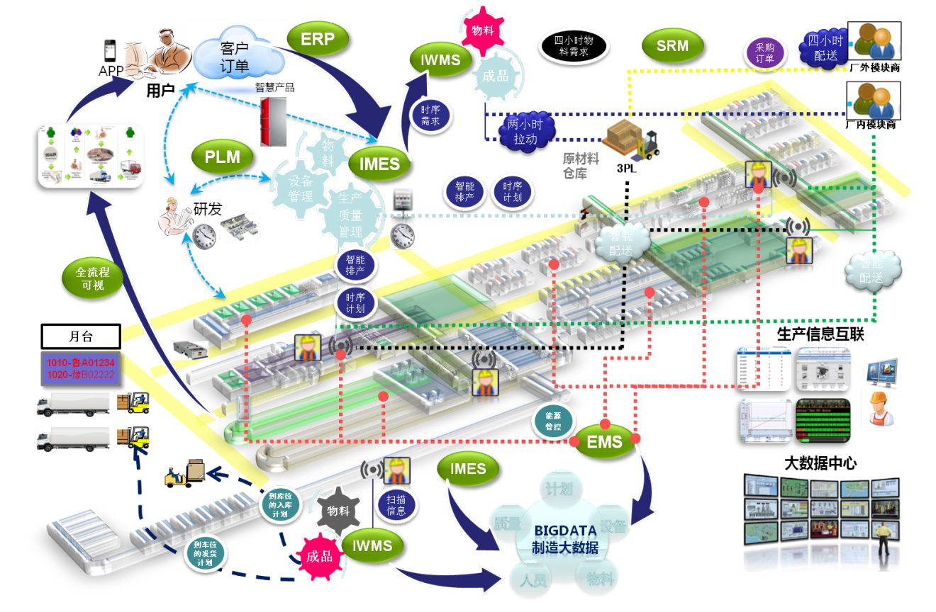 沈陽冰箱智能互聯工廠架構的核心是智能制造執行 iMES 系統,通過iMES驅動ERP、Logitics、PLM(包含CAD/CAPP/設計仿真、制造仿真)、Control(生產數據采集分析等)五大系統集成;業務上通過智能的制造,把制造、研發、物流緊密的互聯互通。通過智能制造執行系統和現場智能化硬件的連接,構建了一個高度靈活的個性化和數字化制造模式,逐步實現從管理、研發、生產、物流的數字化管理,提升企業全系統、全業務的智能化水平。