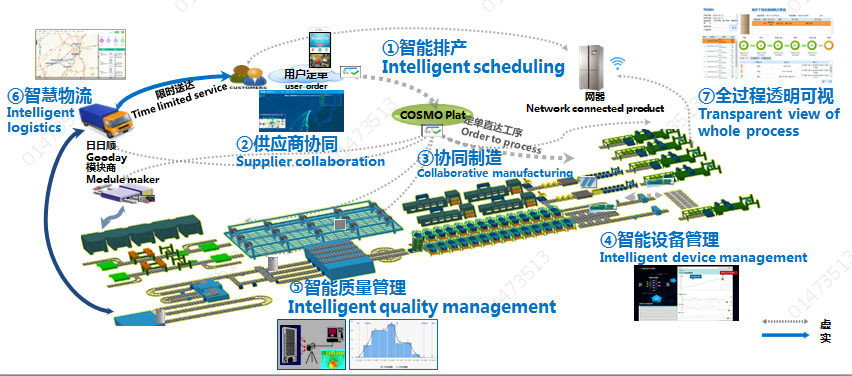 第二、互聯:體現的是網絡化,內外互聯、信息互聯、虛實互聯;與用戶實時互聯,從產品的研發到產品的制造,以及到我們的供應商、物流商,全流程全供應鏈的整合。