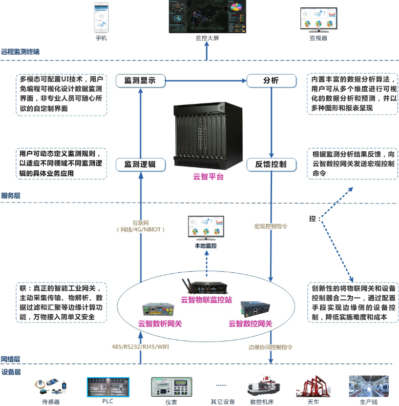 平臺層:通過云智感知平臺,零編成、配置化方式實現數據驅動實現工業裝備的報警聯動、健康診斷和監察監控;