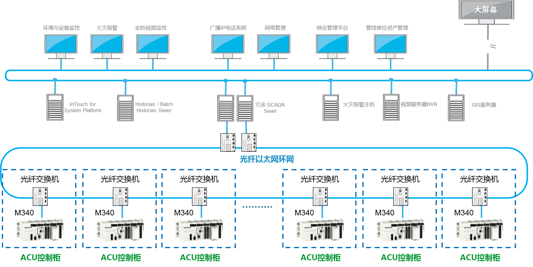 首鋼園區綜合管廊一期工程涵蓋首鋼園區秀池南街和秀池西路。首鋼園區綜合管廊收納了電力、電信、給水、熱力等市政管線,管廊總長約750米,兩艙設計(綜合艙、電力艙),設1個監控中心(含弱電機房)、14個防火分區。綜合管廊采用M340 PLC作為環境與設備監控系統的現地區域控制器。在管廊沿線弱電設備間內設置一臺ACU(內含一臺千兆以太網交換機,一套數據采集控制單元,一套UPS);每個防火區間設置一套現場控制箱ACU(內含一臺千兆以太網交換機、一套數據采集控制單元、一套UPS)。
