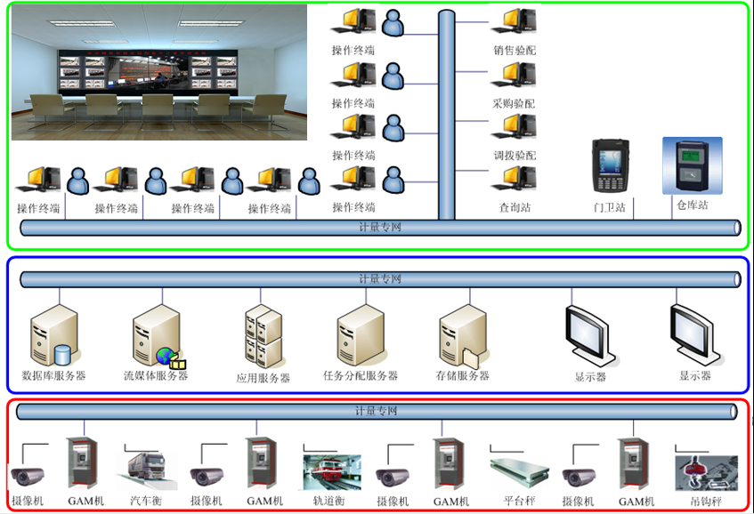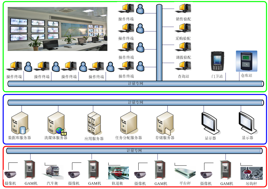 整個系統(tǒng)采用集中管理、分布監(jiān)控的設(shè)計模式,所有的業(yè)務(wù)數(shù)據(jù)(數(shù)據(jù)、語音、圖像、控制信號等)通過無人值守機(jī)(終端)和軟件系統(tǒng)進(jìn)行就地處理,通過計量專用光纖網(wǎng)絡(luò)與控制中心進(jìn)行交互。