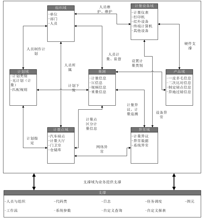 根據(jù)計量業(yè)務(wù)應(yīng)用的數(shù)據(jù)特性,考慮到各主題域之間的關(guān)聯(lián)度,將計量業(yè)務(wù)數(shù)據(jù)劃分為計劃域、組織域、計量設(shè)備域、量測域、產(chǎn)品域、計量點域和異常域等七大域,同時將對上述域形成支撐的公共部分組成支撐域。