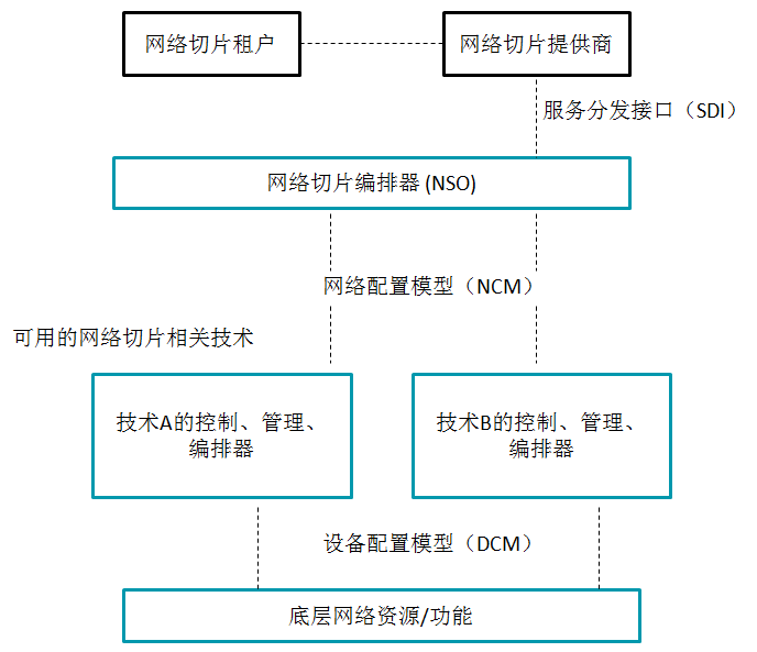 用戶NST通過服務(wù)模型來請求NSaaS,該服務(wù)模型用用戶的語言來描述切片,通常為業(yè)務(wù)體驗類的語言。切片提供者(運營商)將用戶需求翻譯給服務(wù)傳遞模型,這個模型可以用來描述運營商怎么使用自己的資源來提供支持業(yè)務(wù)。該傳遞業(yè)務(wù)模型會被發(fā)送到網(wǎng)絡(luò)切片的編排器(NSO),并且和不同的技術(shù)來映射,進(jìn)一步分解到網(wǎng)絡(luò)配置模型中。最終在網(wǎng)絡(luò)配置模型(NCM)中建立起相對應(yīng)的底層設(shè)施和功能的參數(shù),從而調(diào)用相應(yīng)的底層資源建立起相應(yīng)切片的服務(wù)。