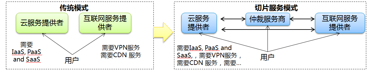 網(wǎng)絡(luò)切片可以實現(xiàn)計算資源與連接資源統(tǒng)籌調(diào)度和編排,滿足垂直行業(yè)需求的網(wǎng)絡(luò)與計算資源一站式服務(wù)。傳統(tǒng)模式下,用戶需要分別向云服務(wù)提供者和互聯(lián)網(wǎng)服務(wù)提供者請求IaaS、PaaS、SaaS服務(wù)以及VPN、CDN等網(wǎng)絡(luò)服務(wù)。網(wǎng)絡(luò)切片可以通過仲裁服務(wù)商提供給用戶集成式一體化的端到端的服務(wù)。