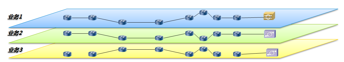 在傳統(tǒng)網(wǎng)絡(luò)“盡力而為”的傳輸方式下,多種業(yè)務(wù)流數(shù)據(jù)在網(wǎng)絡(luò)中混合傳輸,相互干擾,無法確切保證某種業(yè)務(wù)流的傳輸需求,如圖4。網(wǎng)絡(luò)切片可以將大網(wǎng)資源進(jìn)行細(xì)粒度劃分和專用,為不同業(yè)務(wù)提供定制化的保證能力,如同不同業(yè)務(wù)都在各自的“專網(wǎng)”上傳輸,互不干擾,具有專用性、異構(gòu)性和靈活性等特點,如圖5。