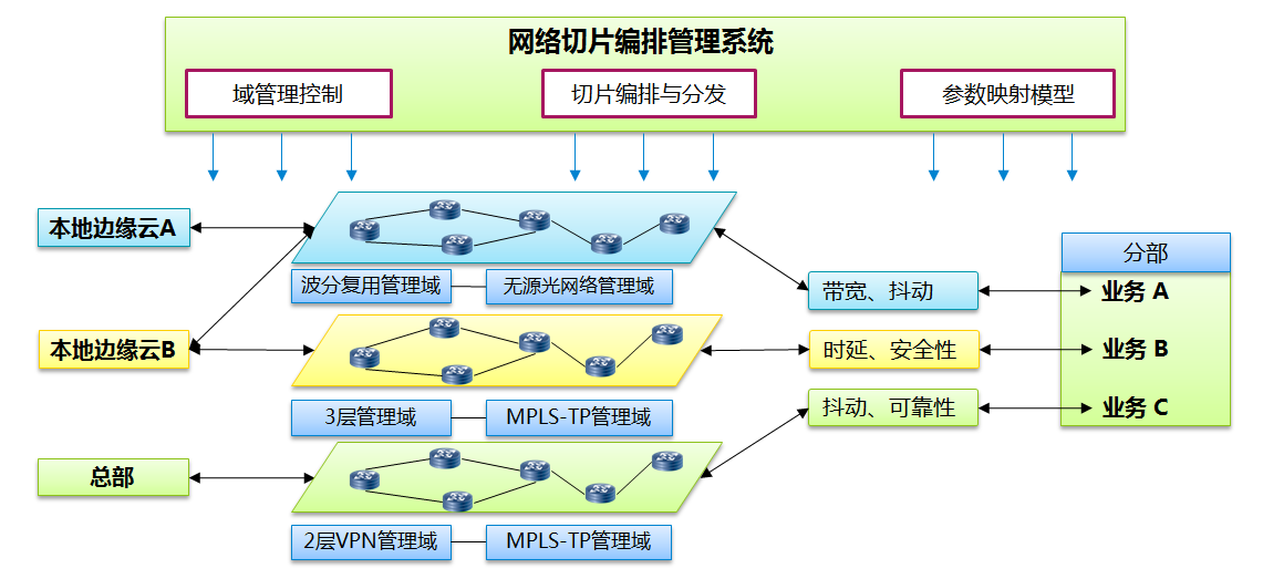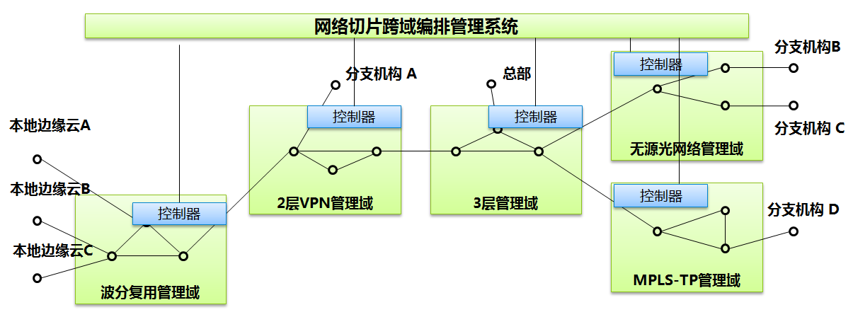 跨管理域編排實現(xiàn)端到端的網(wǎng)絡(luò)切片管理,滿足不同網(wǎng)絡(luò)拓?fù)洹⑿阅芘c功能的需求。網(wǎng)絡(luò)數(shù)據(jù)的傳輸過程中,不同的業(yè)務(wù)會由不同的方式或不同的網(wǎng)絡(luò)協(xié)議進(jìn)行承載轉(zhuǎn)發(fā)。例如,分支機構(gòu)向總部的業(yè)務(wù)請求,可能會經(jīng)過2層VPN到3層路由等協(xié)議,分支機構(gòu)向云發(fā)送業(yè)務(wù)請求,可能會經(jīng)過無源光網(wǎng)絡(luò)到波分復(fù)用的轉(zhuǎn)換等。網(wǎng)絡(luò)切片需實現(xiàn)網(wǎng)絡(luò)各層級轉(zhuǎn)換的無縫銜接,保障業(yè)務(wù)數(shù)據(jù)流端到端的可識別性,從而提供專屬的網(wǎng)絡(luò)切片來進(jìn)行承載和轉(zhuǎn)發(fā)。