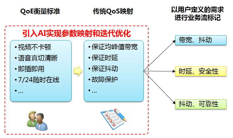 網(wǎng)絡(luò)切片實施的關(guān)鍵步驟是將用戶的實際需求映射為傳統(tǒng)網(wǎng)絡(luò)質(zhì)量需求,例如將流暢清晰地播放視頻和語音,實現(xiàn)網(wǎng)絡(luò)設(shè)備的即插即用以及保障7天24小時隨時在線等需求,映射為網(wǎng)絡(luò)的平均峰值帶寬、時延、抖動以及故障保護(hù)等指標(biāo),從而使網(wǎng)絡(luò)切片提供商提供相應(yīng)專用、隔離、服務(wù)可保證的網(wǎng)絡(luò)切片。并且,可以引入AI技術(shù)實現(xiàn)參數(shù)映射和迭代優(yōu)化,更好的滿足用戶需求。