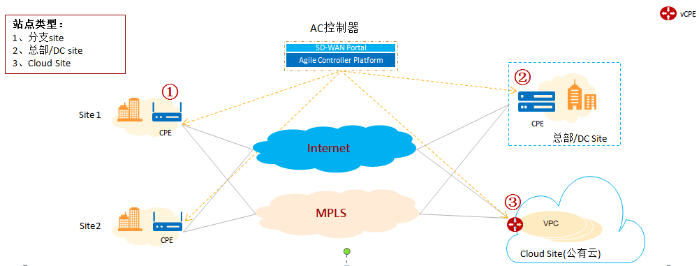 2) 常見的站點類型:企業(yè)分支、園區(qū)、DC、公有云VPC。