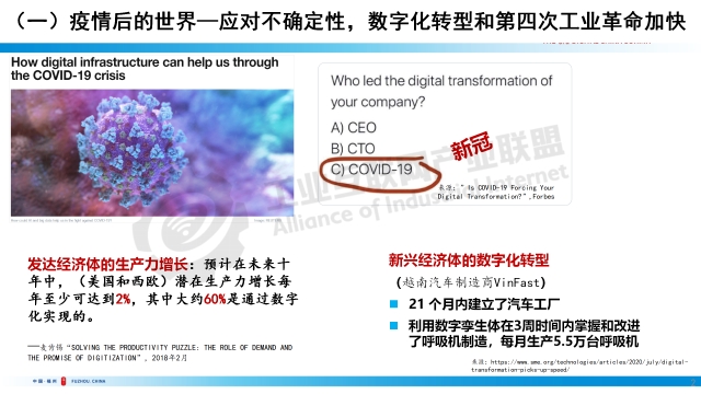“工業(yè)互聯(lián)網(wǎng)是數(shù)字化轉(zhuǎn)型的路徑和方法論,是數(shù)據(jù)驅(qū)動、工業(yè)機(jī)理與智能科學(xué)結(jié)合、數(shù)字空間與物理世界融合的智能化決策閉環(huán)”,余曉暉在演講表明,當(dāng)前對于新冠疫情蔓延,還有新冠疫情以后以及當(dāng)前全球化發(fā)展態(tài)勢,供應(yīng)鏈多樣化,整個產(chǎn)業(yè)國際分工變化,其實有很多不確定性,但是有一點比較確定的是,在新冠疫情后,整個全球數(shù)字化轉(zhuǎn)型和第四次工業(yè)革命將進(jìn)一步加快。
