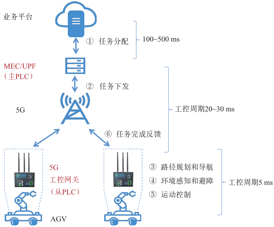 5.1  試驗場景與方案為推動5G與工業深度融合,中國移動聯合產業合作伙伴開展5G vPLC的技術實踐,目前已在十余家工業企業驗證應用。以某典型客戶為例,中國移動為該客戶在生產車間部署了5G網絡,為自動導向車(Automated Guided Vehicle,AGV)物料搬運提供網絡服務。業務需要根據不同類型的物料,由業務平臺規劃AGV不同移動路徑,指引AGV在立庫和不同工段間移動。