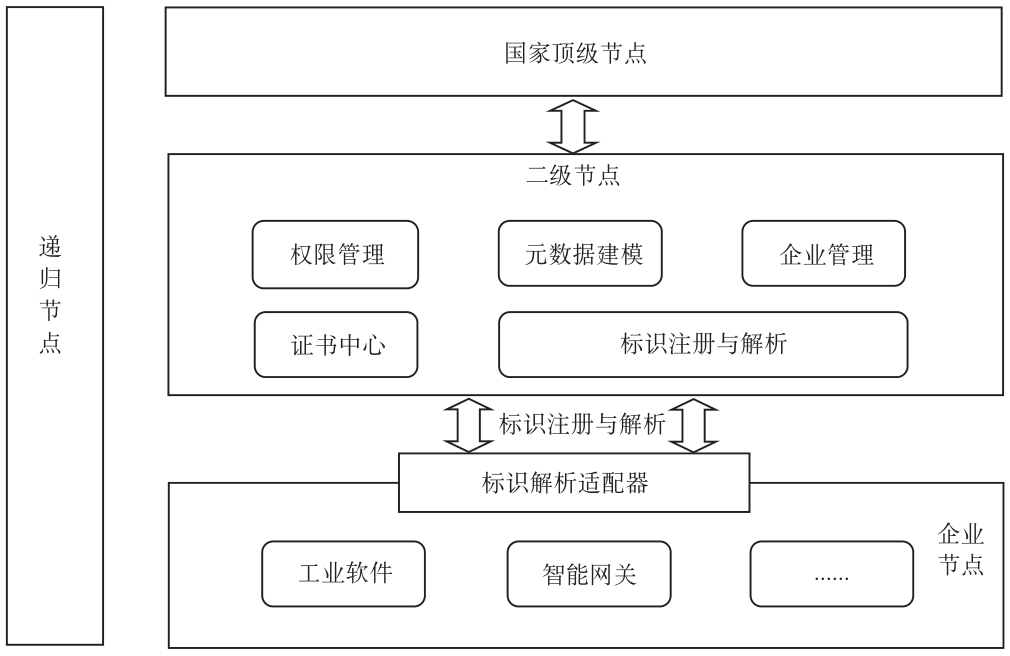 其中,國家頂級節(jié)點是指一個國家或地區(qū)內(nèi)部最頂級的標(biāo)識服務(wù)節(jié)點,可以在全國范圍內(nèi)提供標(biāo)識解析服務(wù)以及標(biāo)識備案、標(biāo)識認證等管理能力。二級節(jié)點是為特定行業(yè)或者通用平臺提供標(biāo)識服務(wù)的公共節(jié)點,用于為工業(yè)企業(yè)提供分配標(biāo)識編碼、證書及標(biāo)識注冊、數(shù)據(jù)解析服務(wù)等。企業(yè)節(jié)點是企業(yè)內(nèi)部的標(biāo)識服務(wù)節(jié)點,可以提供標(biāo)識注冊、解析等服務(wù),既可以獨立部署,也可以作為企業(yè)信息系統(tǒng)內(nèi)的一部分。遞歸節(jié)點是標(biāo)識解析體系的關(guān)鍵性入口設(shè)施,使用緩存技術(shù)手段,快速響應(yīng)客戶端的標(biāo)識解析請求,提升整體解析服務(wù)性能。標(biāo)識解析適配器常用于企業(yè)節(jié)點側(cè)對接企業(yè)業(yè)務(wù)系統(tǒng),將業(yè)務(wù)數(shù)據(jù)進行數(shù)據(jù)加密處理后向二級節(jié)點發(fā)起標(biāo)識注冊;并且負責(zé)對二級節(jié)點返回的標(biāo)識解析結(jié)果進行解密處理,保證數(shù)據(jù)的可用性。