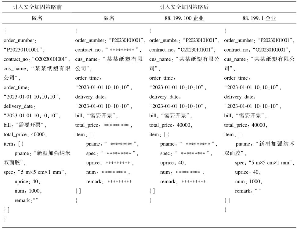 從安全性分析,通過實際案例對加密解密機制進行測試驗證,并根據(jù)采購訂單元數(shù)據(jù)模型(見表1)對應(yīng)的標(biāo)識解析結(jié)果(見表2)可知,引入安全加固策略前,任何身份均可匿名訪問所有信息;引入策略后,隱私數(shù)據(jù)被加密,只有相應(yīng)的授權(quán)用戶才能解密訪問。從而驗證了本方案在隱私保護和數(shù)據(jù)訪問方面的安全有效性,確保了敏感信息的分權(quán)訪問。