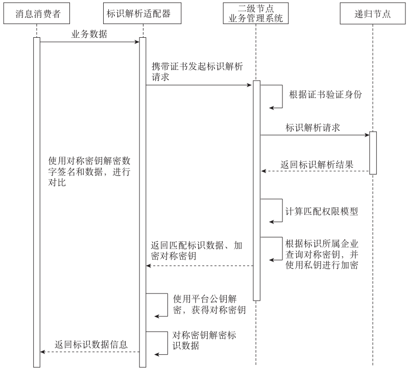 圖4給出了標(biāo)識解析及解密流程。信息消費者的身份校驗通過后,標(biāo)識解析請求將被轉(zhuǎn)發(fā)至遞歸節(jié)點。在拿到遞歸節(jié)點返回的信息后,二級節(jié)點業(yè)務(wù)管理系統(tǒng)會按照元數(shù)據(jù)模板及權(quán)限策略對解析的結(jié)果進行數(shù)據(jù)格式處理,并查詢標(biāo)識所屬的企業(yè)節(jié)點的對稱密鑰。首先,二級節(jié)點業(yè)務(wù)管理系統(tǒng)會使用平臺私鑰對查詢到的對稱密鑰進行加密,以確保密鑰在傳輸過程中得到保護。然后,將加密后的對稱密鑰與經(jīng)數(shù)據(jù)格式處理后的解析結(jié)果一起返回給標(biāo)識解析適配器。接下來,標(biāo)識解析適配器接收平臺返回的信息,使用平臺的公鑰對加密的對稱密鑰進行解密,從而獲得真正的對稱密鑰。利用該對稱密鑰,標(biāo)識解析適配器可以對經(jīng)數(shù)據(jù)格式處理的結(jié)果進行解密,最終獲得標(biāo)識解析的結(jié)果。通過這一流程,標(biāo)識解析適配器能夠安全地獲取并使用對稱密鑰,從而保障敏感數(shù)據(jù)在傳輸和處理過程中的安全性。標(biāo)識解析結(jié)果能夠被正確地還原并返回給信息消費者,實現(xiàn)了對標(biāo)識的解析和數(shù)據(jù)的獲取。
