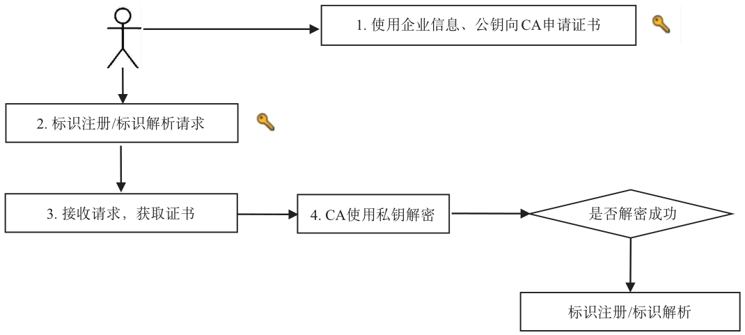 若解密成功,說明證書是由CA平臺的私鑰加密而獲得的,證明信息消費者的身份合法可信,即完成了對請求者的身份鑒別。在此情況下,二級節(jié)點可以繼續(xù)處理標(biāo)識解析請求,提供相應(yīng)的標(biāo)識信息。反之,若解密不成功,意味著該請求者的身份存在異常情況。二級節(jié)點會將解密失敗識別為異常情況,并采取相應(yīng)的安全措施,包括拒絕處理請求、記錄異常事件并通知相關(guān)安全團隊等,以保障整個標(biāo)識解析體系的安全。通過這樣的身份驗證流程,標(biāo)識解析體系能夠確保信息消費者的身份是合法且可信的,避免了未經(jīng)授權(quán)的用戶或節(jié)點獲取敏感標(biāo)識數(shù)據(jù),從而保護了企業(yè)的數(shù)據(jù)和系統(tǒng)安全。
