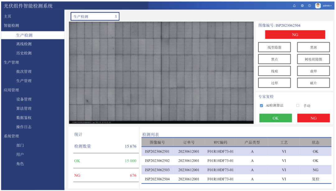 在產線側部署了一套基于云邊端架構的AI質檢系統(質檢平臺架構如圖5所示,光伏質檢系統界面如圖6所示),從EL質檢儀獲取圖像數據,面對主要的19種缺陷進行自動檢測。對工業產線初始過檢率、漏檢率高的問題,本項目采集兩萬張樣本進行模型訓練,迭代70余輪后,檢測精度由部署前的漏檢率10%提升至部署后的漏檢率<0.2%、過檢率<4%。同時,系統將重點質檢數據上報邊緣側部署的工業質檢業務平臺,實現質量數據全流程智能化管理。除此以外,在機器代替人工的數字化轉型浪潮中,中國移動上海產業研究院還為客戶提供了數字化管理全套解決方案,助力企業完成管理模式的變革。