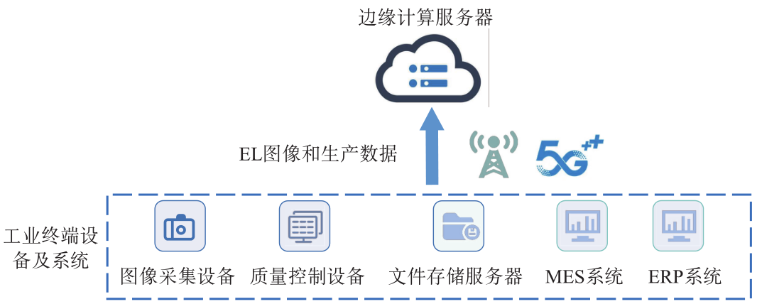 3.2.1  EL圖像數據采集基于5G智能網關的EL圖像數據采集與傳輸方法,通過5G智能網關采集生產現場的數據,借助5G專網大帶寬、廣連接、低時延的特點[9],將分散在生產現場的眾多設備、系統中的數據上傳到邊緣計算服務器。借助5G專網,EL圖像可以實時傳輸,使EL設備安裝、布局時不再拘泥于現場網線布置限制,可以隨時隨地將圖像實時傳輸到OnePower-AI質檢平臺;同時,5G網絡的大帶寬特性確保EL圖像可以高質量傳輸:快速傳輸4~8 K的EL圖像,100%保留EL圖像的細節和清晰度,提高了光伏檢測算法的識別準確率[10]。EL圖像數據采集及傳輸過程如圖2所示。